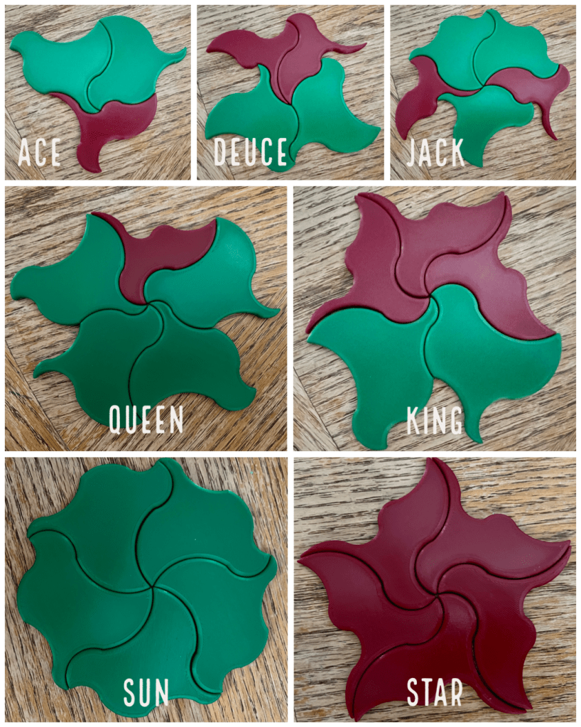 There are seven “starting patterns” that you can use to begin a tiling design, shown below. If you start with the “star” or “sun” central patterns, the resulting design will not only be non-periodic, but it will also have fivefold rotational symmetry.