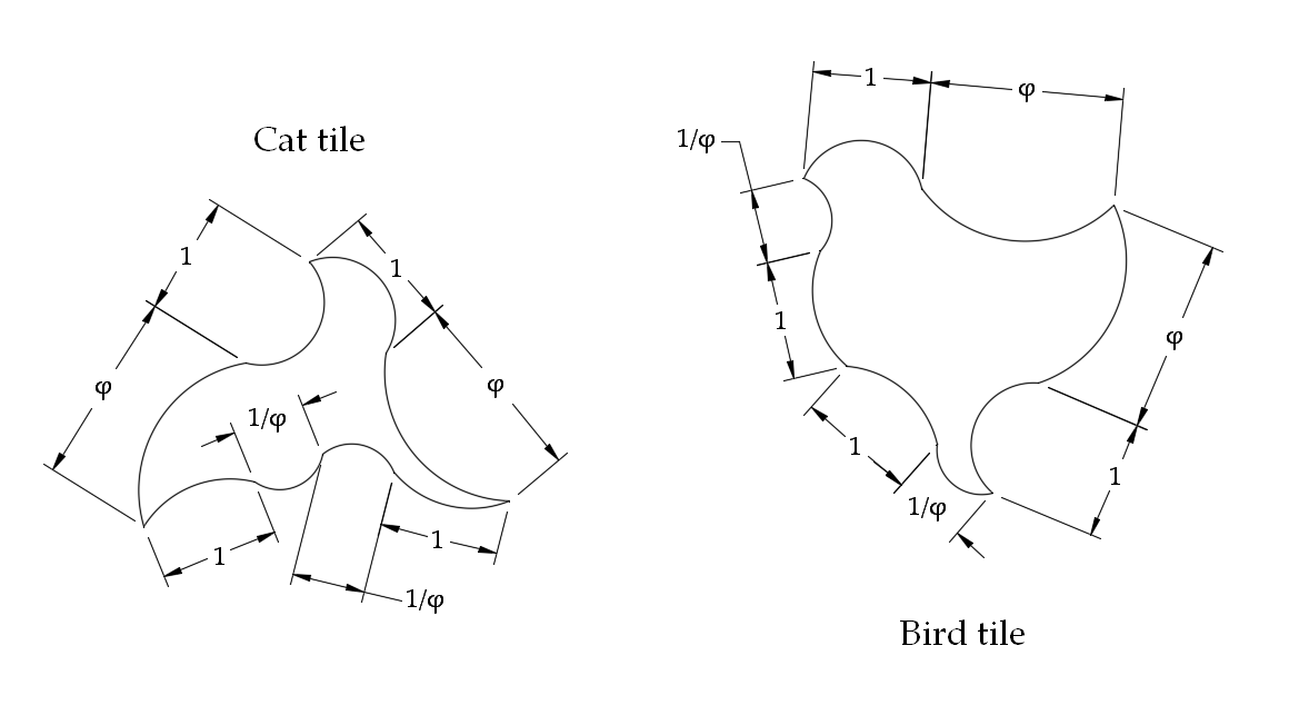 When making cookies, bear in mind that for tiling purposes, you’ll need more birds than cats – an infinite plane filled with these tiles will require φ (~1.618) birds per cat. Consider also the fact that individually, the birds have more area than the cats, so for a given amount of dough, you’ll be able to cut out more cats than birds, which is the opposite of what you want for tessellating. Perhaps the best strategy here is to make more than you need of both and eat the excess.
