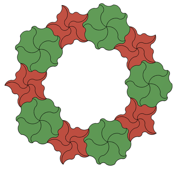 This design includes arcs that enforce the non-periodic pattern. The chord lengths of the arcs follow the Golden Ratio: